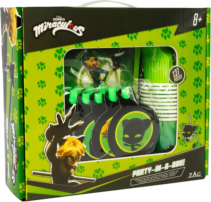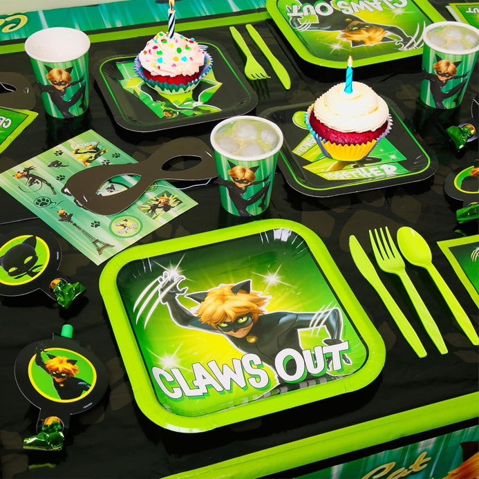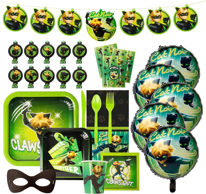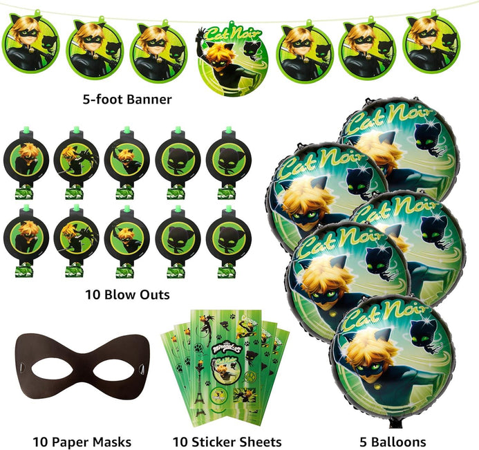 OFFICIAL MIRACULOUS CAT NOIR PARTY-IN-A-BOX Embark on a feline-fantastic celebration with Cat Noir and his pals! This Cat Noir-themed party kit has everything you need to kick off an adventurous party. QUALITY PARTY DECORATIONS & SUPPLIES Each Party-In-A-Box includes (1) 5-foot Banner, (10) 9-inch Paper Plates, (10) 7-inch Dessert Plates, (10) 9 oz Paper Cups, (30) 3 ply Napkins, (30) Utensils. (1) 17-inch Mylar Balloon, (10) Sticker Sheets, (10) Paper Masks, (1) 72-inch Tablecloths and (10) Foil Blow Outs. EASY DECORATING With this Miraculous Cat Noir-themed Party-In-A-Box, we've simplified decorating for your child's party without spending hours! Everything you need is included, making it a breeze to set up and celebrate