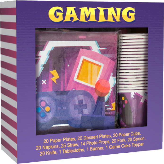 - VIDEO GAME PARTY THEME: Each Video Gaming Party-In-A-Box includes: 20 Paper Plates, 20 Dessert Plates, 20 Paper Cups, 25 Paper Straws, 20 Napkins,1 Tablecloth, 20 Forks, 20 Knives, 20 Spoons, 1 Happy Birthday Banner, 1 Cake Topper