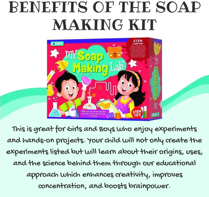 • SCIENTIFIC ACTIVITY FOR KIDS: This innovative STEM learner Soap making Kit is the best gift for your child that loves crafts and science. Kids can make soap at home as it includes a beautifully illustrated learning guide so that any child can follow along. Through this kit, explore aims at helping children take another step forward in STEM education.