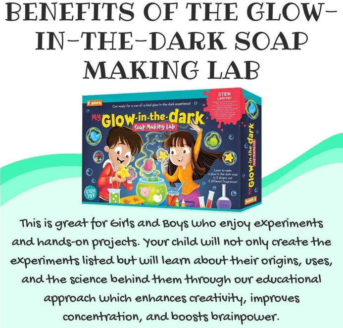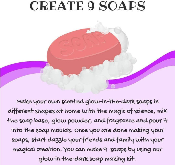 - PRODUCTS YOU CAN MAKE: Get ready for a one-of-a-kind glow-in-dark experience; with this, you can learn how to make glowing soap in your home. You can make 9 glowing soaps in 3 different shapes and 5 different fragrances with this kit.