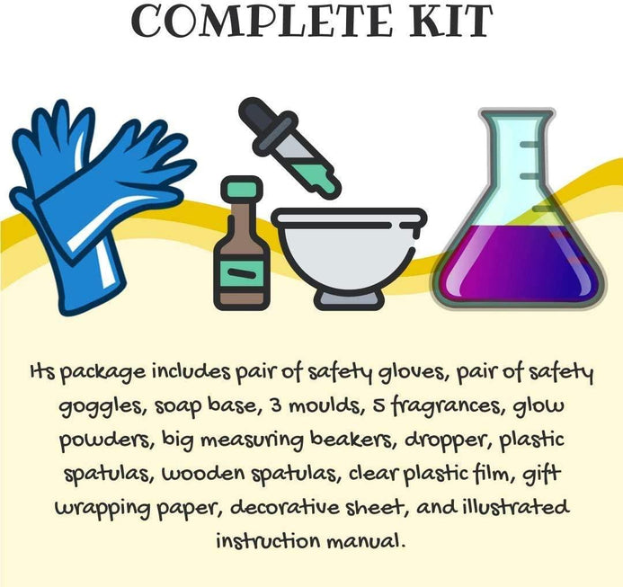 - PACKAGE INCLUDES: This package comes equipped with all the necessary contents, it includes Pair of safety gloves, Pair of safety goggles, a Soap base, 3 molds, 5 fragrances, Glow powders, Big measuring beakers, Droppers, Plastic spatulas, Wooden spatulas, Clear plastic film, Gift wrapping paper, Decorative sheet, Illustrated instruction manual.