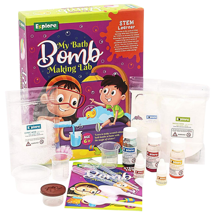Get ready for a fun bathing experience with My Bath Bomb Making Lab brought to you by Explore! With this educational toy, learn to make your own colorful and scented bath bombs using the knowledge of chemistry. This package comes equipped with all the necessary contents so that you can perform numerous experiments without any hassle. Inside, you will get a detailed instruction manual for ease-of-use and guided experience in your play. Turn your play area into a science lab and be a genius scientist with all the knowledge of chemistry you gather from the experiments. Learning and playing together was never this fun! Its package includes Baking soda, Citric acid, Droppers, Red, yellow & blue cosmetic coloring, 2 fragrances, Small Measuring beakers, a Plastic bowl, Wooden spatulas, Plastic spatulas, Cornflour, Illustrated instruction manual. The numbers of final products you can make by using this kit are: 3 Bath Bombs 2 Face/Body Masks Learn to make scented colorful bath bombs at home using the magic of science!