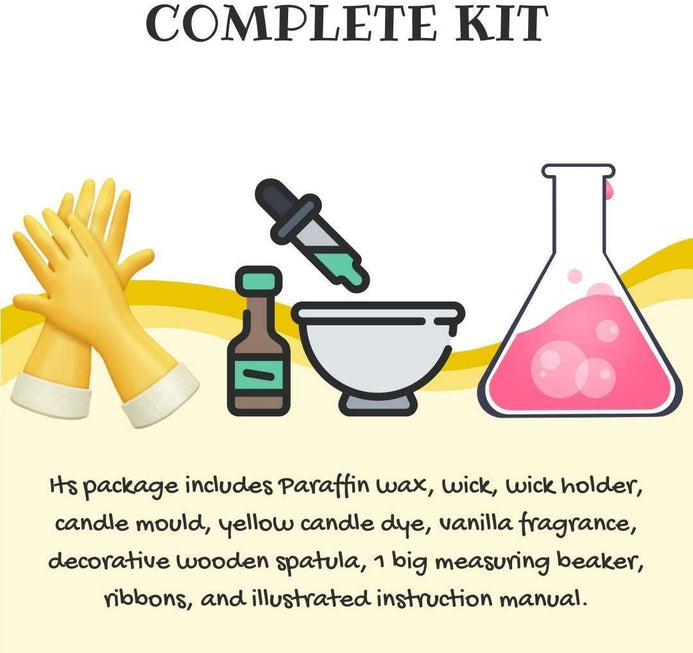 - PACKAGE INCLUDES: It comes with all necessary equipment, it includes Paraffin Wax, Wick, Wick holder, Candle mold, Yellow candle dye, Vanilla fragrance, Decorative, Wooden spatulas, 1 Big measuring beaker, Ribbons and Illustrated instruction manual.