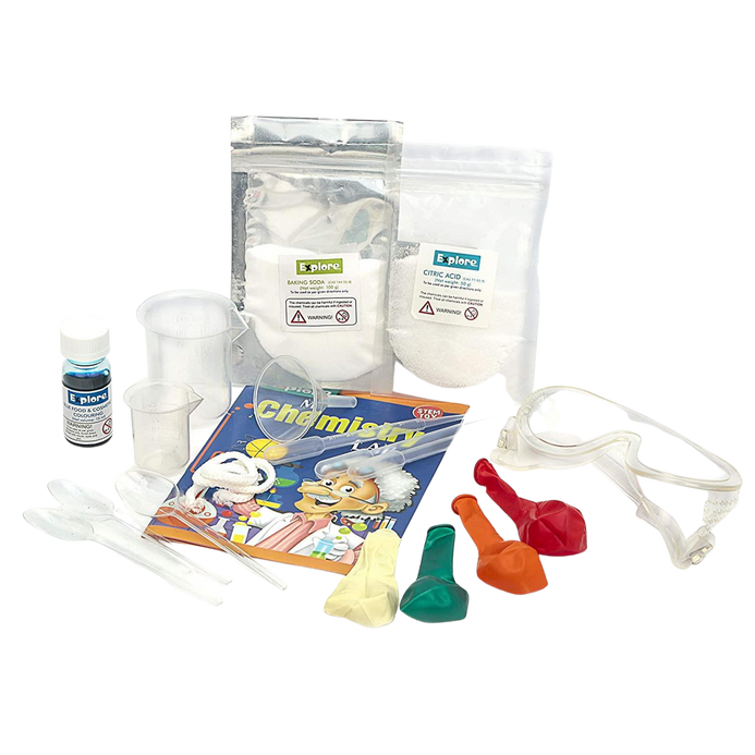 - COMPLETE KIT: This package comes with a complete kit; it includes Balloons, Baking Soda, Citric Acid, Food Coloring, Small Measuring Beakers, Droppers, Plastic Spatulas, Safety Goggles, Funnel, and Illustrated instruction manual.