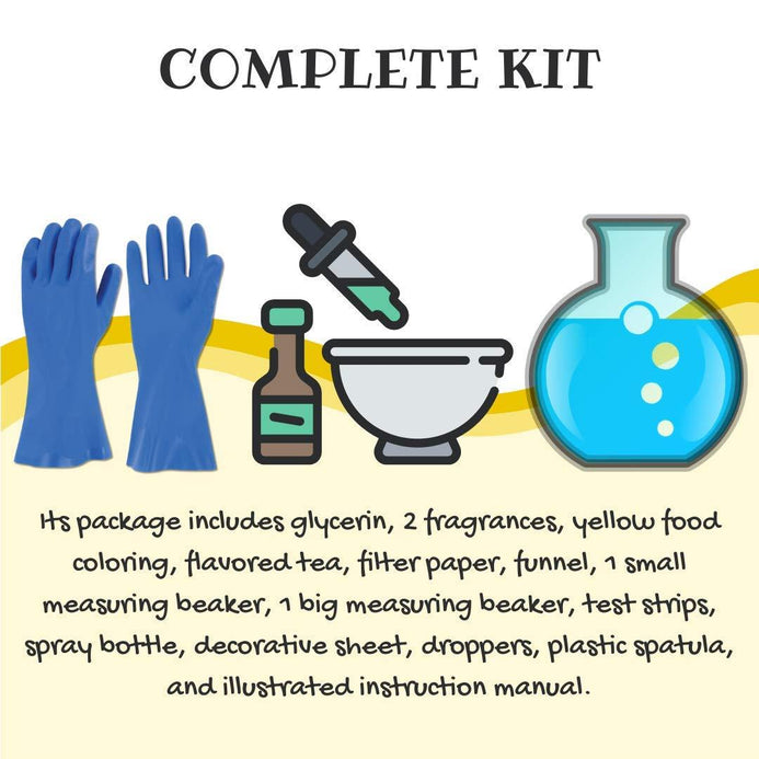 - PACKAGE INCLUDES: It comes with all necessary content, it includes glycerin, yellow food coloring, 2 fragrances, Flavored tea, filter paper, funnel, 1 big measuring beaker, test strips, spray bottle, decorative sheet, droppers, plastic spatula, decorative sheet, illustrated instruction manual.