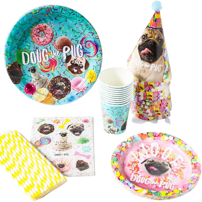 Throwing the perfect Doug The Pug themed party is as easy as ordering this one box! The Doug The Pug Party In A Box from Mighty Mojo Toys includes everything you need for a party of 10. Serveware, plates and cups are all included, as well as decor, party hats and even a cupcake stand. Bring the party with you anywhere in this light-weight, easy-to-carry box.
