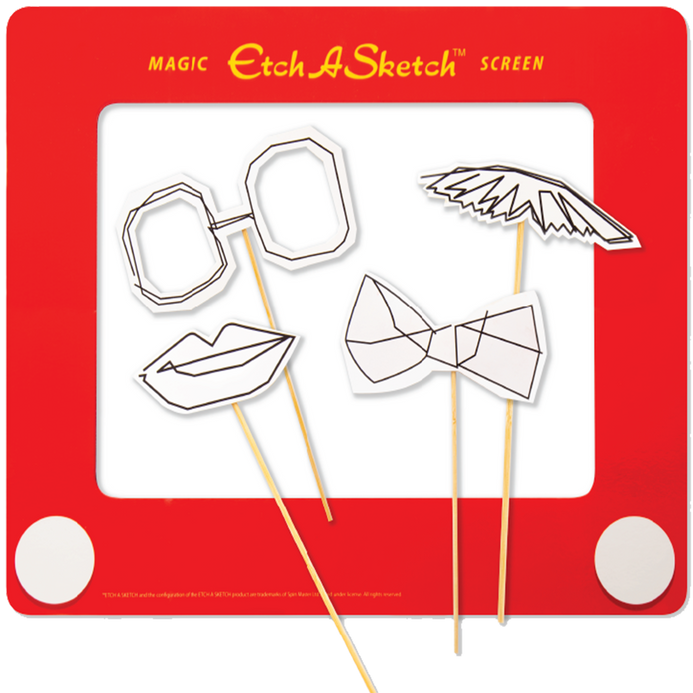 Make the celebration more memorable with these fun and hilarious Etch-A-Sketch Photo Booth Props inspired by real Etch-A-Sketch drawings! Includes one Etch-A-Sketch Frame, a Bow-tie, Lips, Moustache and pair of Glasses