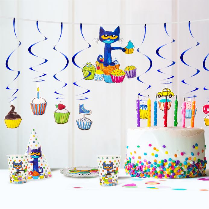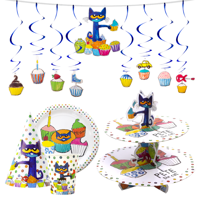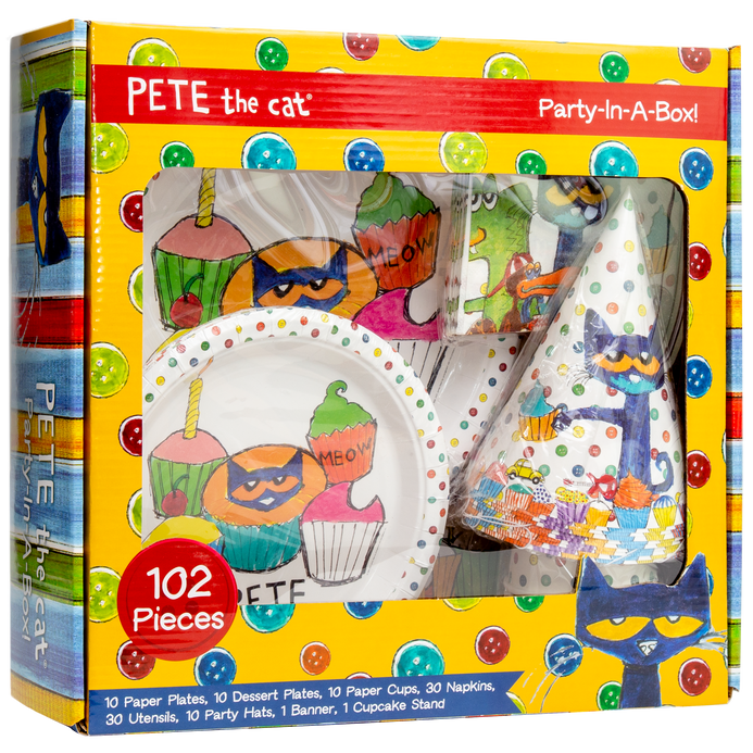 - OFFICIAL PETE THE CAT PARTY IN A BOX! - With over 75 Million Books sold worldwide, Pete the Cat has filled the hearts of children with his groovy positive messages! Everything you need to get your party started featuring Pete the Cat party and table decorations!