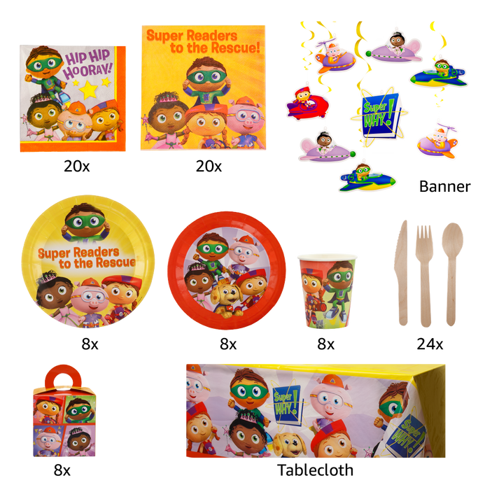 • EASY DECORATING - With this Super Why! kit, we’ve made it super easy for you to decorate for your child’s party without spending hours! Includes everything you need to decorate and celebrate including tableware and decorations with the Super Why! theme!